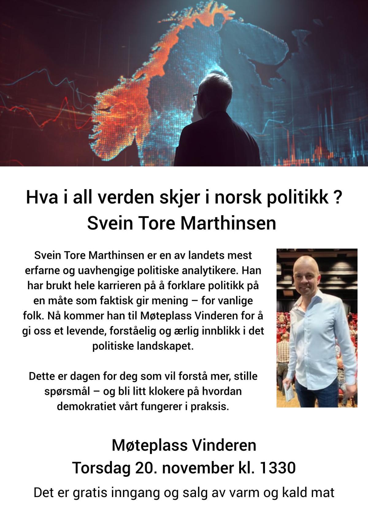 Velkommen til foredrag med Svein Tore Marthinsen, en av landets mest erfarne og uavhengige politiske analytikere.